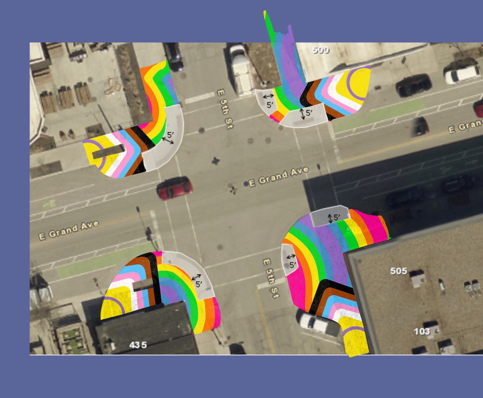 We were specifically tasked with using the progress flag as a starting point. We updated the colors of the flag to bring a neon vibrancy to the area. In 2025 we will add the City of Des Moines progress flag to one corner.