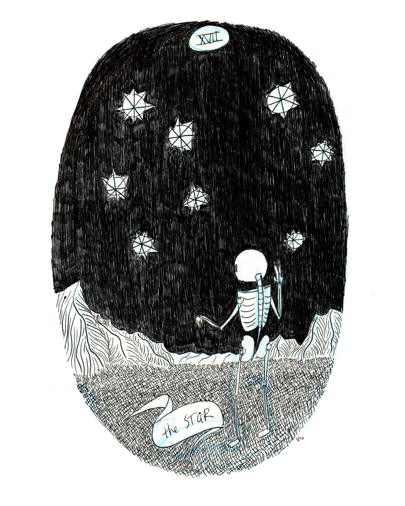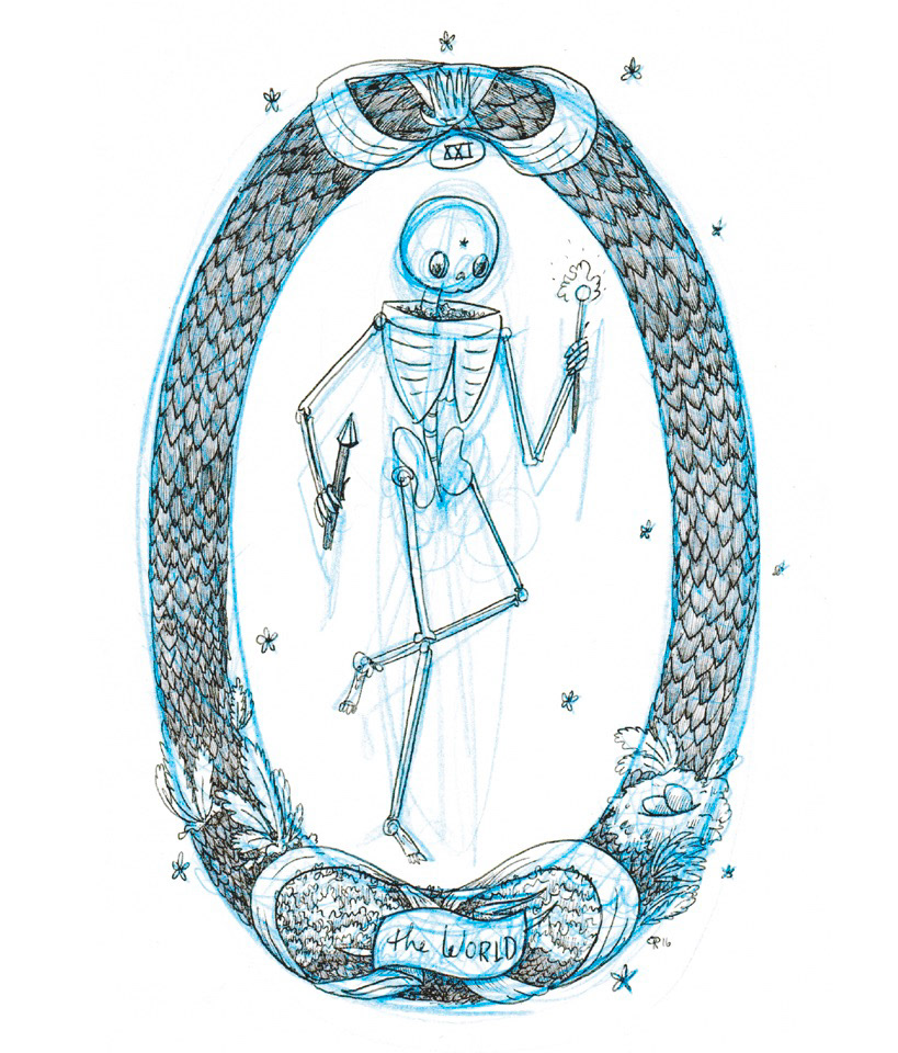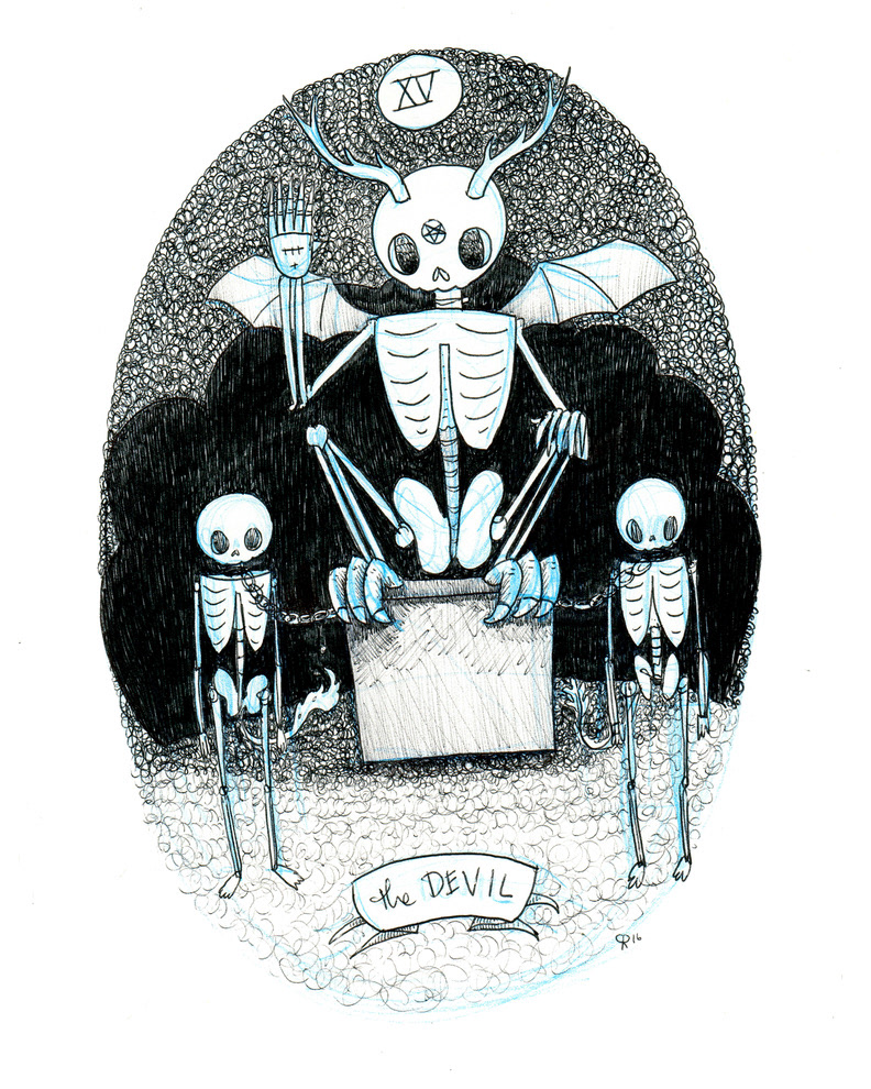 In 2017 I illustrated and published a full 78-card tarot deck. The Skeleton Tarot contains a mix of original and classic imagery. We've gone through a number of reprints, have sold thousands of decks, and are carried in shops around the world. Here are a few of my favorite cards in the deck.