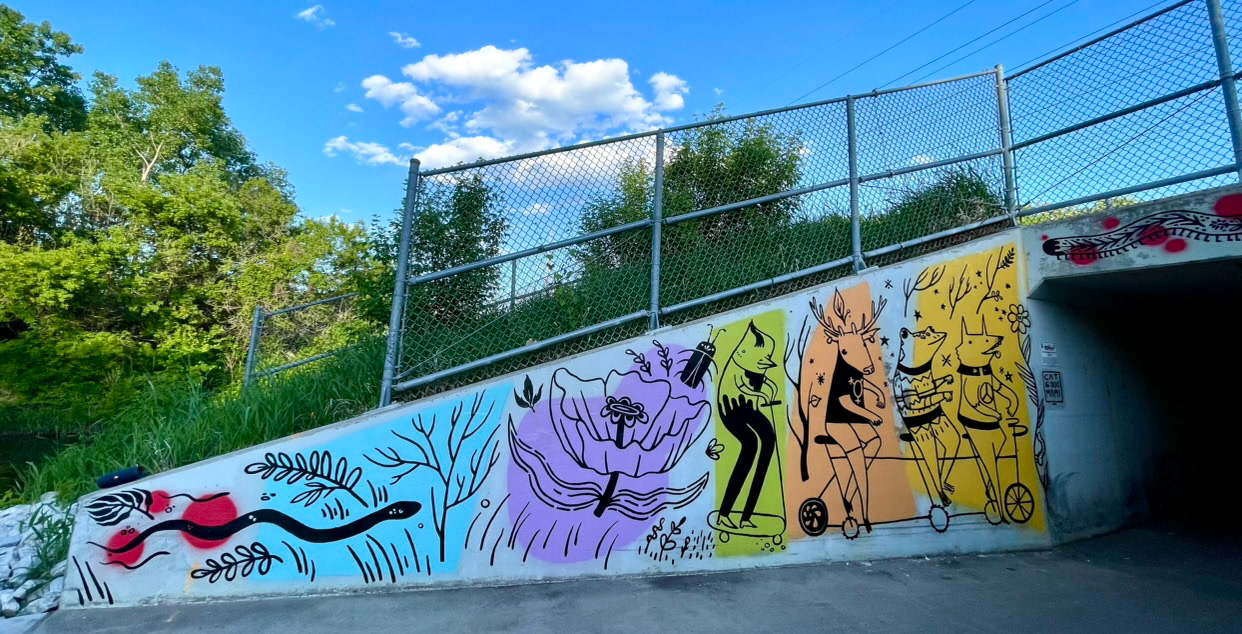 I have painted three murals for West Des Moines's Art on the Trail. This one is my favorite. I used the 2022 theme, "People You Meet on the Trail", to explore the animal people found on the trail. This mural includes blue jays, fish, snakes, deer, turtles, frogs, foxes, and more. This was particularly fun for me as I painted the mural, situated as it was on a stream, so I did have kingfishers, ducks, fish, frogs, ospreys, and more to keep me company.