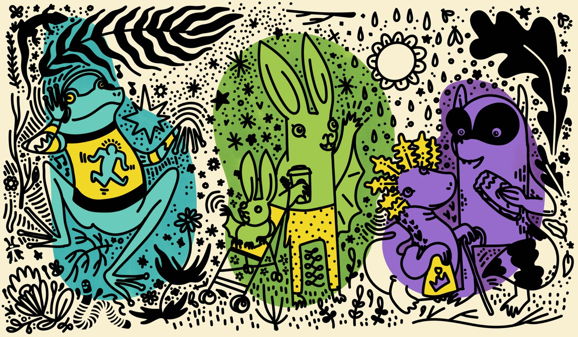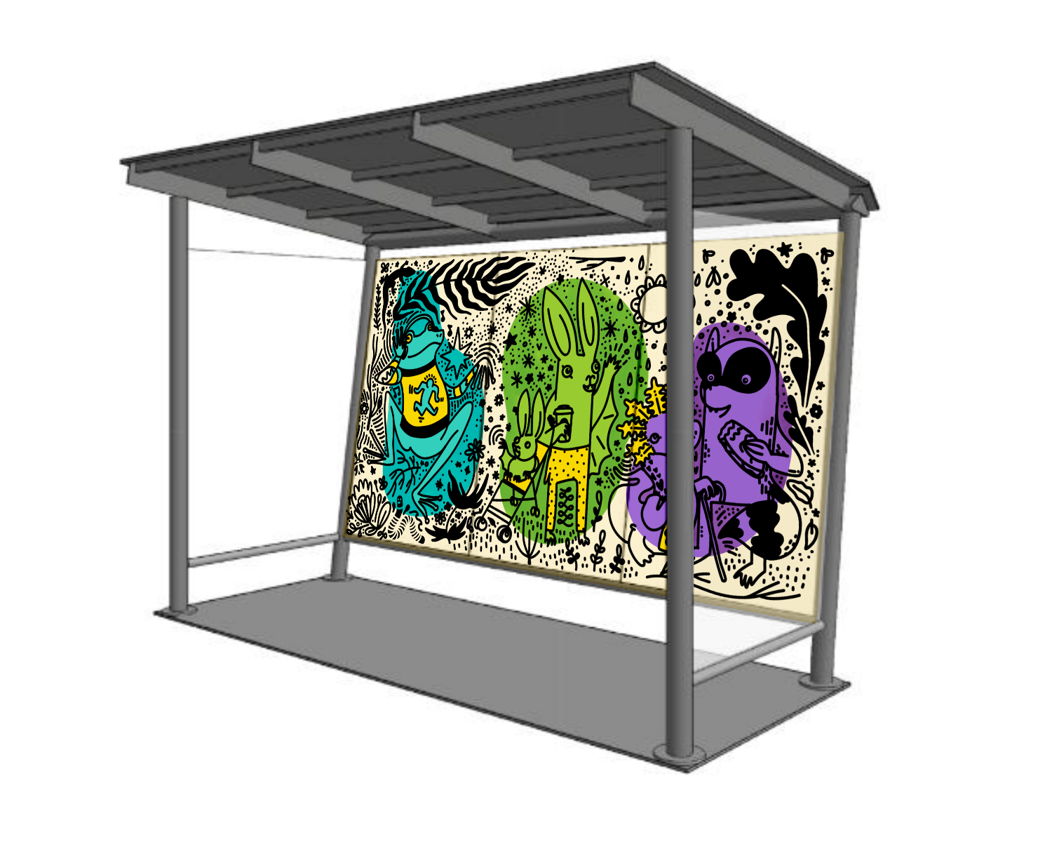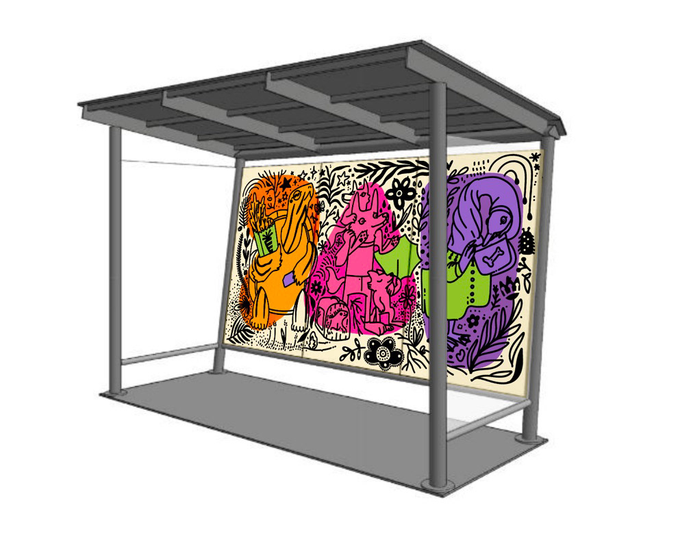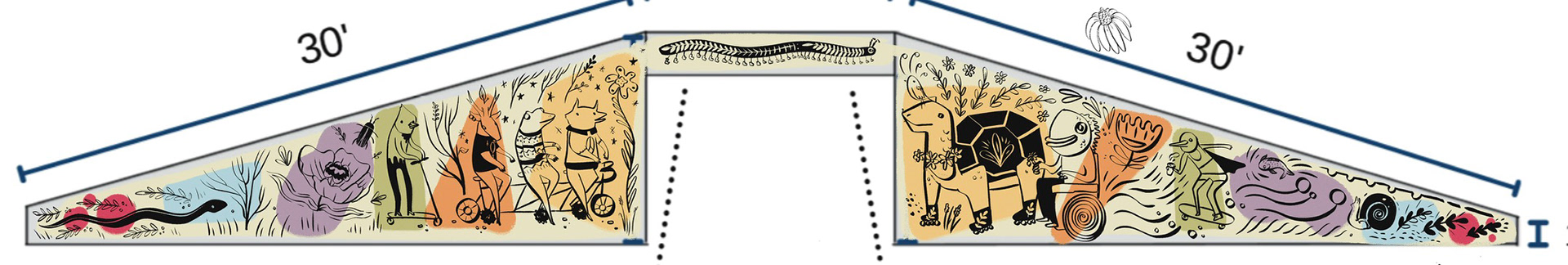 DART invited me to submit a proposal for a neighborhood bus shelter. I used the style of creatures I've put in murals before - such as The People You Meet on the Trail - and illustrated a variety of my neighbors. Some are grocery shopping, with bags from the local shops. Others are waiting for the bus with kids, or have brought along their pets for a visit to the neighborhood vet clinic. Each character has a relationship to the block -- and each one also represents an animal native to the area. The screens would be a fun, inviting design intended to provide company to people waiting to catch the bus.