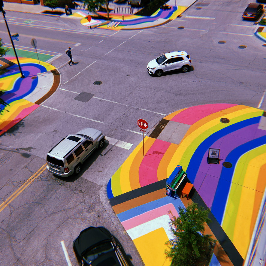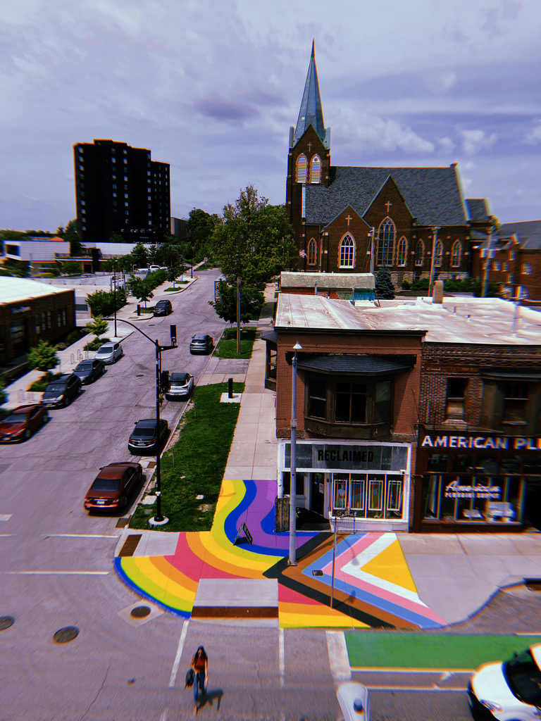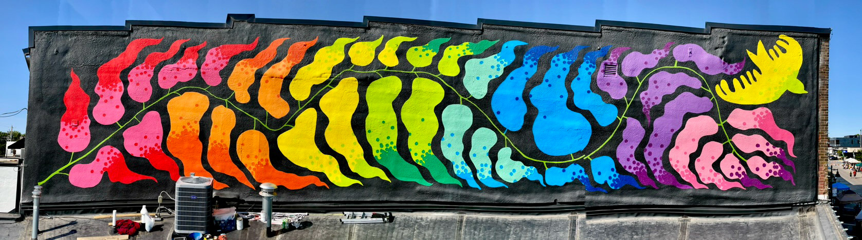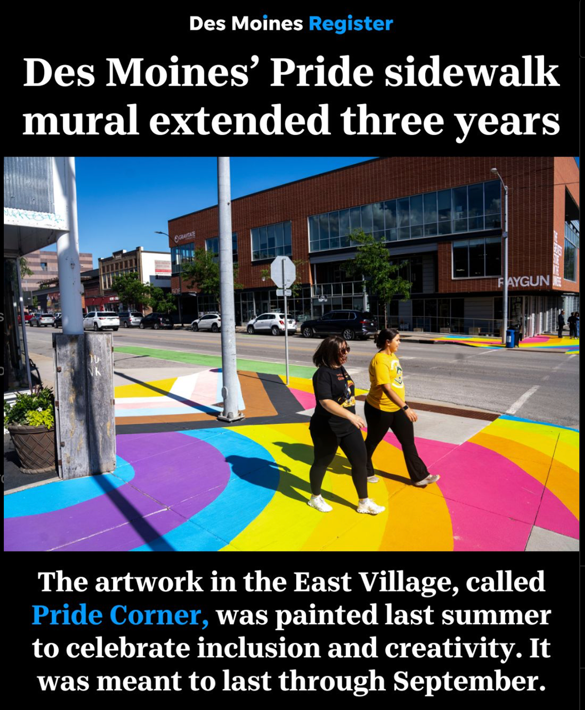 Dani Awesome and I were hired to design and execute a mural that brought life to four corners at the center of Des Moines' Pide festivities. Initially installed as a 12-month license, the mural will be reworked in 2025 and given extended life for several more years. This is the first mural of its kind in the city of Des Moines and is the result of cooperation between Capital City Pride, the East Village Neighborhood, and the City of Des Moines.