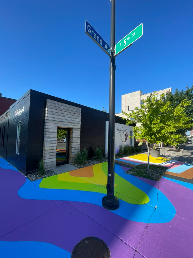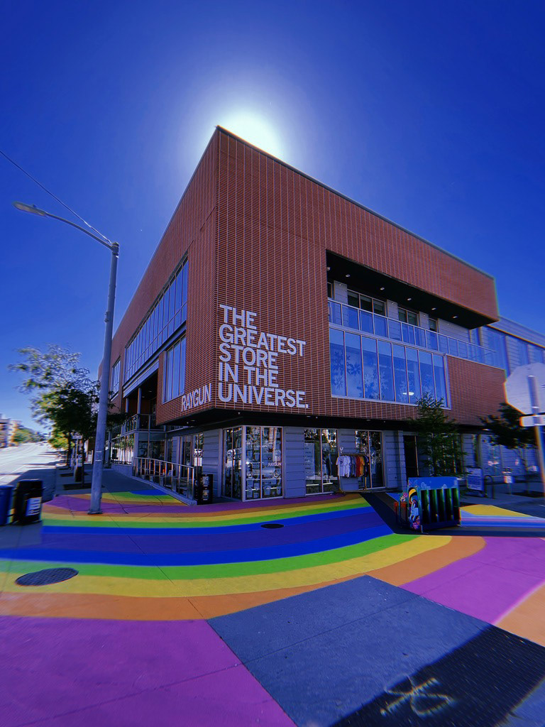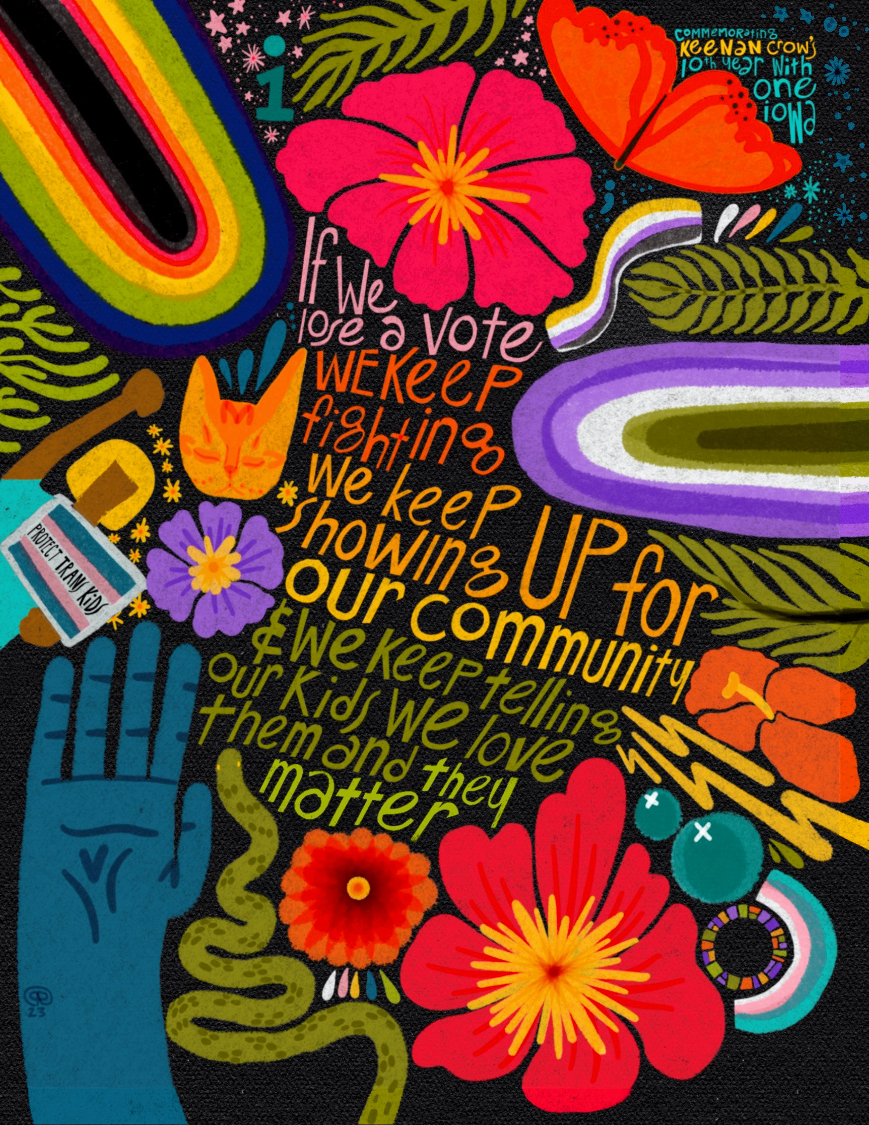 Dani Awesome and I were hired to design and execute a mural that brought life to four corners at the center of Des Moines' Pide festivities. Initially installed as a 12-month license, the mural will be reworked in 2025 and given extended life for several more years. This is the first mural of its kind in the city of Des Moines and is the result of cooperation between Capital City Pride, the East Village Neighborhood, and the City of Des Moines.